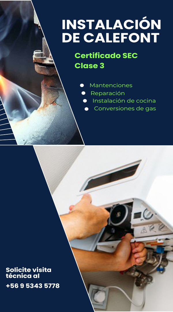 Intalación de calefont, realizamos mantención de todas las marcas. Instalación de termoeléctrico. Realizamos evaluación SEC para identificar si el área donde va a instalar cumnple las normativas. Garantía por 90 días posterior a la instalación.